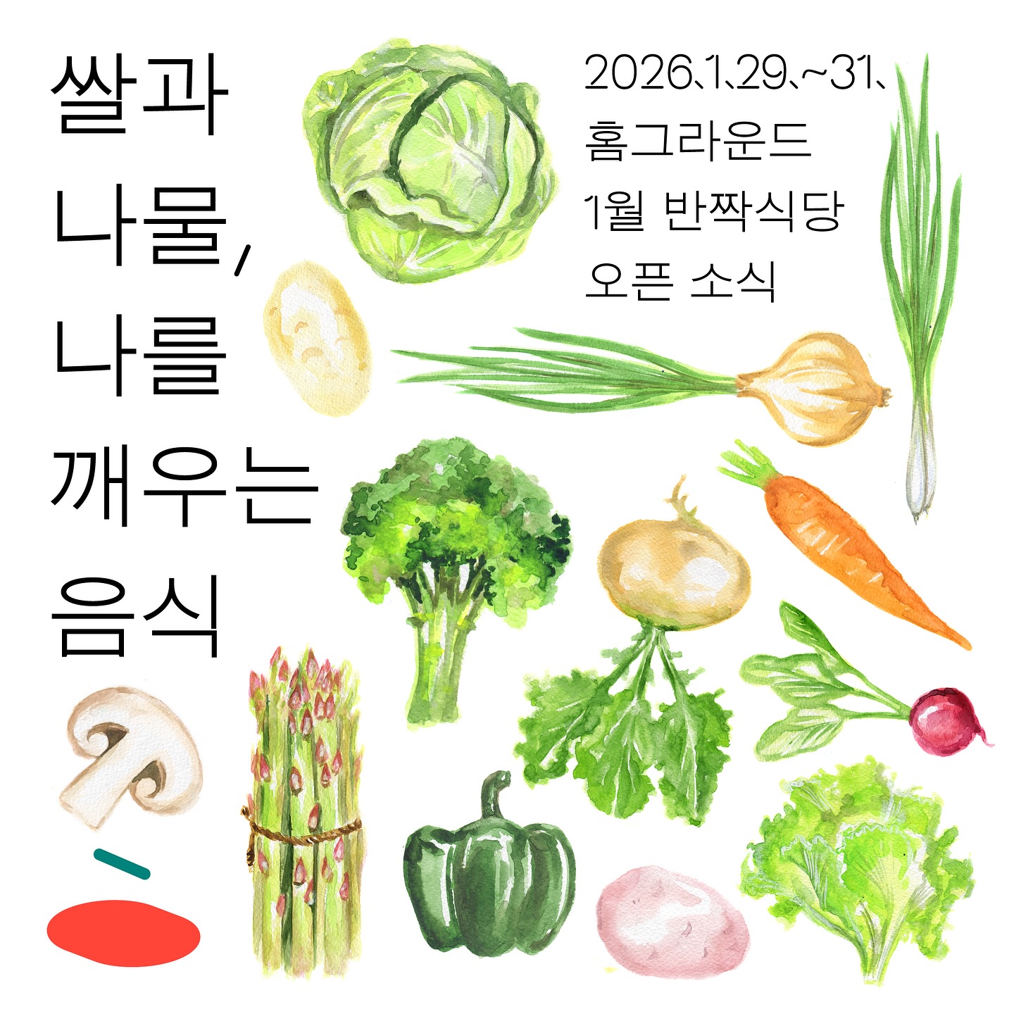 [2026.1.29~31 <쌀과 나물, 나를 깨우는 음식>반짝식당]저는 새해마다 새로워야한다, 부지런해야 한다, 몸에 나쁜 것을 가리고, 일찍 일어나 생활해야 한다는 부담감에 괴로워하는 편입니다. 새로운 달력에 적응하는 도시인의 자잘한 마음 치레 정도지만, 연말의 흥과 피로를 다스리고 평상심을 찾기까지 시간이 걸립니다. 사업을 하는 사람으로서는 올 한해 어떻게 살아나갈지 고민하는 시기가 1월이라 더 그런 것 같습니다. 이럴 때일수록 식사를 가려하는 것은 자연스러운 일인 것 같습니다. 겨우내 땅 아래에서 봄의 기운을 품은 나물들이 시장에 나올 때야 몸과 마음이 움직입니다. 매해 나물식을 반짝식당을 통해 챙기고 있습니다. 올해도 쌀과 나물식을 함께 먹고자 홈그라운드식 나물 백반으로 반짝식당을 엽니다. 천천히 꼭꼭 씹으며 입에 가득 차는 풀과 땅의 맛이 앞으로를 무사히 나는 데에 작은 도움이 되기를 바랍니다.그럼, 오랜만에 뵈어요. [나물 쌈 정식 - 비건 | 논비건 세트 35,000원]- 냉이와 버섯 무 잡곡밥- 돌김과 봄나물 간장- 어린 쑥 튀김- 봄나물 겉절이- 톳 계란말이+섬초파래페스토 | 비건은 톳 두부 무침과 무 구이- 참도미와 광어 유자 미나리 들기름 타르타르 | 비건은 유자 새송이 감자 미나리 타르타르 + 와사비와 산초- 베리 콩포트와 반건시를 올린 요거트 | 비건은 비건 요거트- 박하차에서 변경> 맥파이앤타이거 쑥차 [별도 주문]- 봄나물 파스타 (오일 | 페스토 중 선택) 22,000원- 봄나물 크림 오믈렛(난각1번란)과 곡물빵 22,000원- 와인 글라스 가득 13,000원 | 보틀 66,000원 | 하프보틀 33,000원- 잘 어울리는 청주나 약주도 조금 준비합니다. (경주법주 초특선, 일엽편주)- 고흥 유자 민트에이드 7,000원- 홈그라운드 곶감말이 1줄 15,000원~16,500원 #쌀과나물 #나를깨우는음식