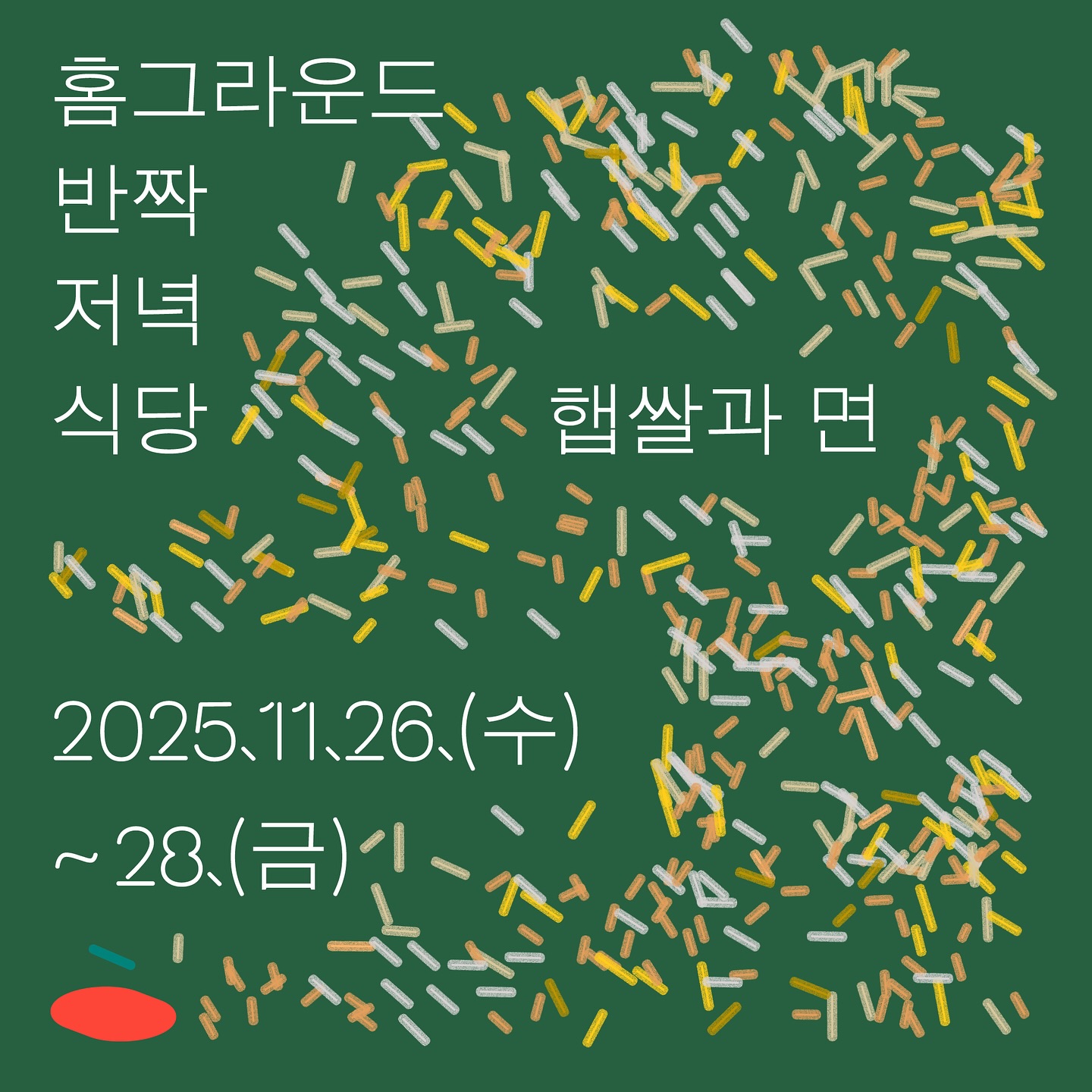 [2025.11.26~28 #홈그라운드_반짝_저녁_식당 <햅쌀과 면> 운영안내] 영혼을 살찌우는 쌀과 면요리로 홈그라운드 작업장을 오랜만에 열었습니다. 11월 여러가지 쌀을 맛보고 맛있는 밥 짓는 방법을 배웠는데요. 현미잡곡밥 마니아인 제가 백미의 진가를 알게 된 계기이기도 했습니다. 햅쌀이 잔뜩 나는 지금, 다양한 경기미를 가지고 만든 쌀요리와 이태리 면요리, 쌀과 포도로 만든 술을 준비했습니다. ———[쌀요리 22,000원]-연진 늙은호박 버섯리조또 (연천쌀, 연진)-비건-꿈마지 파마산 무 토란 크림 리조또 (평택쌀, 꿈마지)-골든퀸 배추 토마토 해산물 도리아 (구례 유기농 골든퀸)-커리 오곡 아란치니와 커리마요 (구례 유기농 골든퀸과 오곡) [면요리 22,000원]-알새우 시금치파래페스토 파스타 (숏파스타 사용, 비건 옵션 가능)-파와 마늘, 모시 파스타 [채소요리 18,000원]-햇무와 감, 석류, 시나몬 크림의 샐러드 -비건 [쌀 디저트와 주류]-골든퀸 쌀 푸딩 (유제품 함유) 5,000원-아이스크림을 곁들인 크링클 사과 파이 (견과류, 카다멈과 시나몬, 유제품 함유) 10,000원 [과실 음료와 주류]-오미자황매실에이드 7,000원-경기미 막걸리와 청주 (종류별 상이)-와인 (종류별 상이) #홈그라운드_반짝_저녁_식당 #햅쌀과면 도움주신 곳: 테이스트파크디자인: 홍은주김형재 @repetitivelyrepeat @hk_of_ehhk
