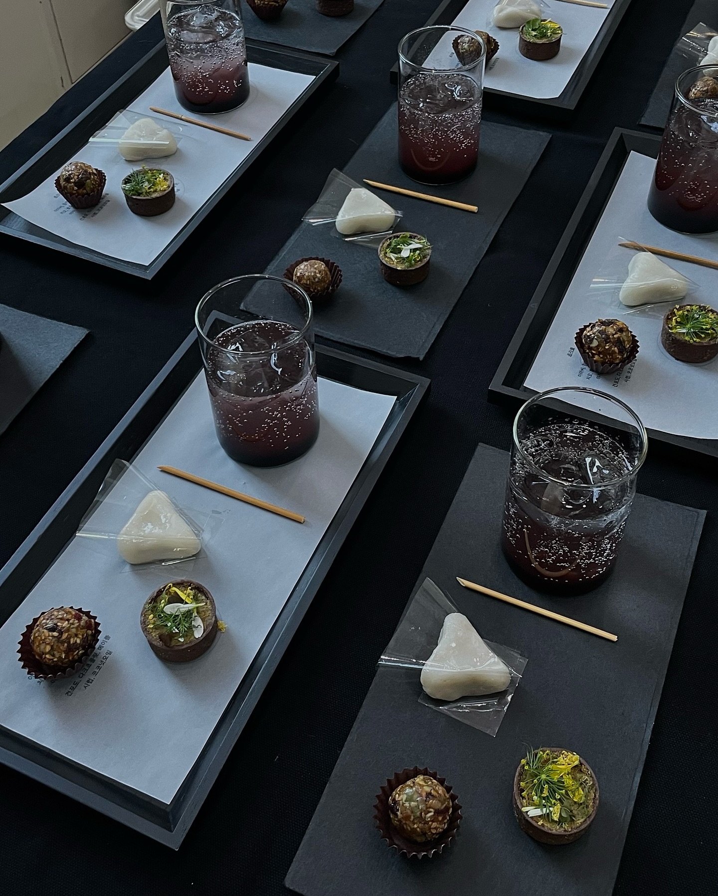 [2025.12.22 서울시립미술관 서소문본관 <최재은 : 약속> 오프닝 케이터링] 서울시립미술관 서소문본관에서 시작한 <최재은 : 약속> 전의 오프닝을 위해 전시작이자 작가가 진행한 프로젝트를 살펴보며 키워드를 뽑아 보았습니다. 🌏 풀, 흙, 씨앗, 루시(인류), 검은 바다 흙과 풀맛: 피스타치오페이스트와 다크쵸콜릿 소를 채우고 옥살리스와 허브, 꽃을 올린 쵸코타르트 씨앗맛: 작가의 작업요소인 종자볼을 닮은 씨앗에너지볼-각종 씨앗과 건과일을 둥글게 뭉친 형태 루시(인류): 최초 인류 여성으로 기록된 루시의 골반뼈, 모든 면이 둥근 삼각 형상을 닮게 빚은 깨송편 검은 바다맛: 다크 카카오와 블루베리, 레몬을 블랜딩한 에이드 다시 풀맛: 따뜻한 박하차 <약속 세트>로 구성했습니다. 액자와 같은 블랙우드트레이와 식물조직이 드러나는 닥지, 먹색의 한지로 만든 검은 플레이트를 사용하여 전시작과 분위기를 연결하였습니다. 상 위의 침봉 꽂이는 DMZ의 무질서한(하지만 자세히 들여다보면 질서정연한) 초목을 생각해보며 꽂아보았습니다. 몇년동안 서울시립미술관에서 큰 주제 삼아 지속하고 있는 [기후위기, 환경]에 관한 전시 오프닝을 맡아 왔습니다. 전시 내용을 살피고 가급적 자연물을 이용해 자연스러운 상차림과 메뉴를 제안드렸습니다. 아름다움 안에 즐거운 여정이었습니다. 요즘은 드물게 미술관 일을 하지만, 방문할 때마다 저희의 시작점인 공간임을 느낍니다. 의뢰: 서울시립미술관 전시교육분과행사 준비와 진행: 홈그라운드 최선아, 박소연, 한진이