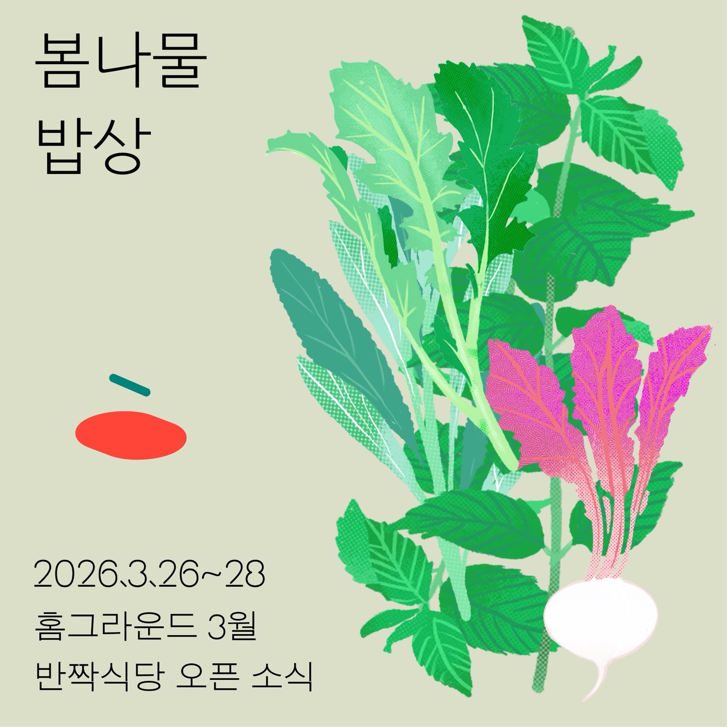 [2026.3.26~28 <봄나물밥상>반짝식당] 저는 사는 게 막연할 때면, 기분 좋은 식사로 기억한 장소를 다시 찾아요. 시골장에서 들고 온 먹거리를 펼쳐보며, 잊지 않아야 할 것을 떠올려보는 봄입니다. 금세 더워져 쌉싸름하고 고소한 나물 맛이 사라지기 전에, 3월도 나물 밥상으로 문을 열었습니다.진안 마이골 발효원에서 3년 묵은 된장과 간장을 보내주셔서, 좋은 소금, 기름과 함께 가볍게 간한 나물 요리들을 정식으로 차려보았습니다. [메뉴]1. 봄나물 정식 (비건 | 논비건) 38,000원-나물채소찜과 나물장(마, 미나리, 감자, 두릅, 아스파라거스, 비트, 마늘종, 곰취 등 / 감귤쌀누룩 숙성의 송어필렛 추가시 +10,000원)-나물무된장국-쑥버무리-나물주먹밥-두부참나물무침-참송이와 땅두릅피클-원추리 달걀찜 | 비건은 원추리 콩조림 -전호나물 샐러드-두유요거트를 올린 감귤푸딩-따뜻한 한국차 [단품 파스타 25,000원]-원추리 달래 조개 파스타 (페스코) -참송이, 금이, 팽이 해방풍 파스타 (비건) [음료]레몬 오미자 에이드 7,000원와인과 논알콜 맥주 [살 수 있는 것]홈그라운드 곶감말이 1줄 16,500원~18,000원