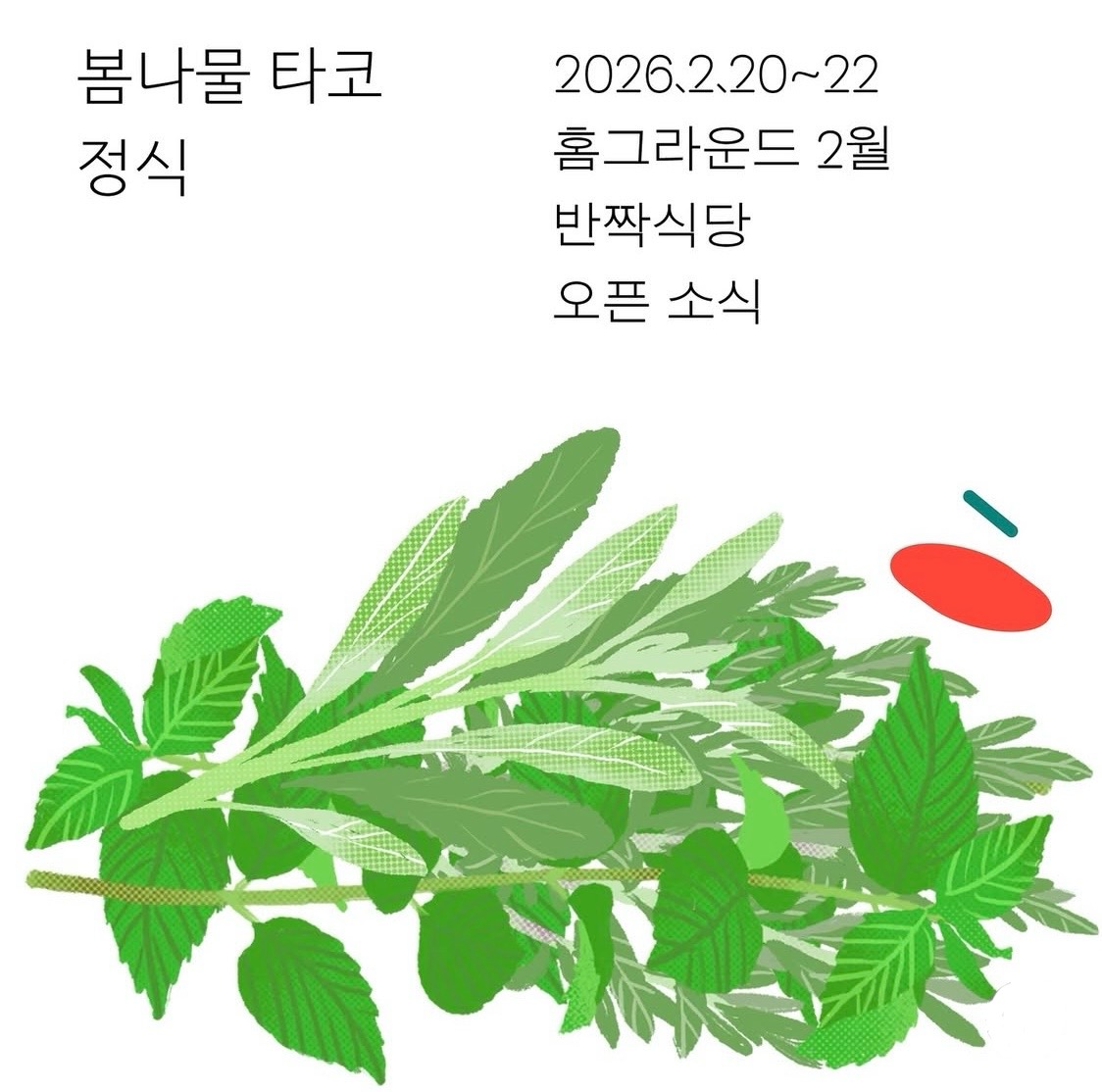 [2026.2.20~22 #홈그라운드_반짝식당 2월 봄나물 타코 정식 진행 공지] 새해 복 많이 받으세요!!! 봄 기운이 가득한 새해입니다.지난 봄을 들춰보니, 하수상한 정치적 상황에 수심이 가득했습니다. 🌝💦그런데 입 안 가득 나물과 상큼한 금귤, 튀김을 또띠아에 넣고 말아 구워 먹었더라고요. 사사삭 @sasasag.kr 친구들과요.심난함 잊고 하하하. 웃음이 나는 맛이라고 했습니다. 올해도 빼먹을 수 없습니다. ☺️제주로부터 @from.jeju__ 가 고른 맛있는 금귤을 받았어요. 이렇게 달고 과즙 많은 금귤은 오랜만입니다. 🌝 자라는 만물 사이에서 나물과 함께 일찍부터 봄을 만끽해보려 홈그라운드의 문, “반짝” 엽니다. 잘 쉬고 주말에 놀러오셔요! 🌱 곧 만나요! —— [메뉴]봄나물 타코 정식 (비건 | 논비건) 38,000원: 취향껏 조합해 싸먹는 쌈 정식 입니다. -블루콘&호밀 또띠야-봄나물 타코: 금귤샬롯살사, 율무렌틸보리표고볶음, 마늘 캐슈마요와 살사베르데, 라임, 세발나물, 알새우(비건은 새송이구이), 양배추겨자절임+치즈 취향껏-냉이크림을 얹은 구운 감자 (비건은 냉이 비건 마요)-땅두릅, 아스파라거스 튀김 & 피클-콜리플라워 스프-호박차젤리를 얹은 늙은 호박 푸딩-박하차 [단품]봄나물 조개 파스타 (페스코) 25,000원봄나물 크림 버섯 파스타 (비건은 오일로 제작) 22,000원 [음료]레몬 오미자 에이드 7,000원와인과 논알콜 맥주 [살 수 있는 것]홈그라운드 곶감말이 1줄 16,500원~18,000원