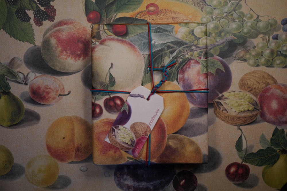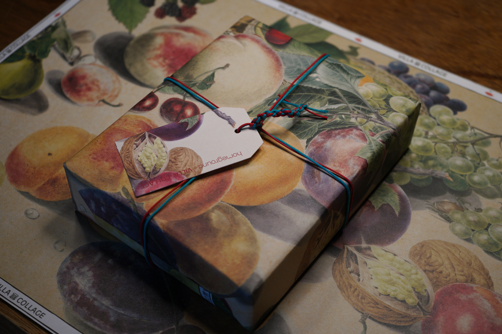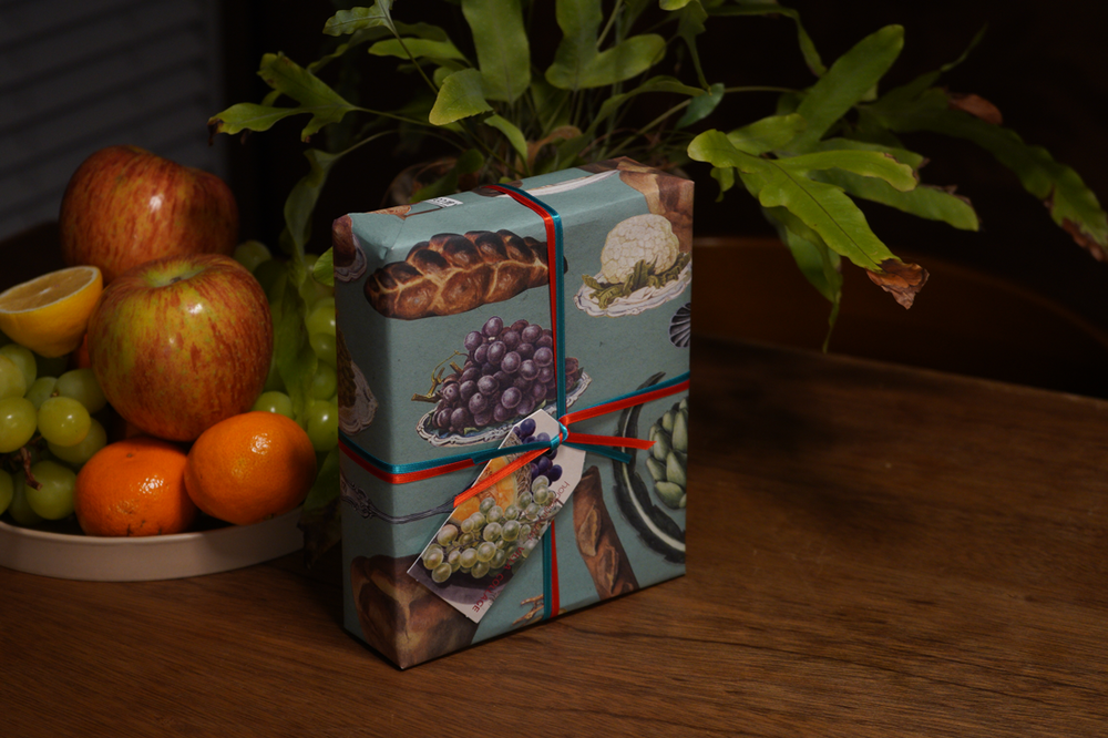 과일 테마 포장은 색 끈으로 포장하여 매듭을 짓습니다.