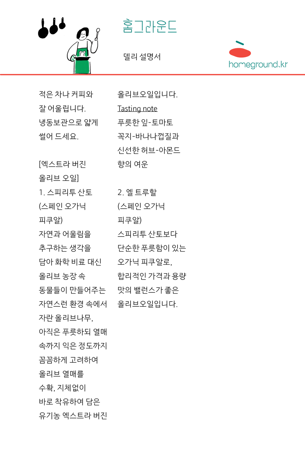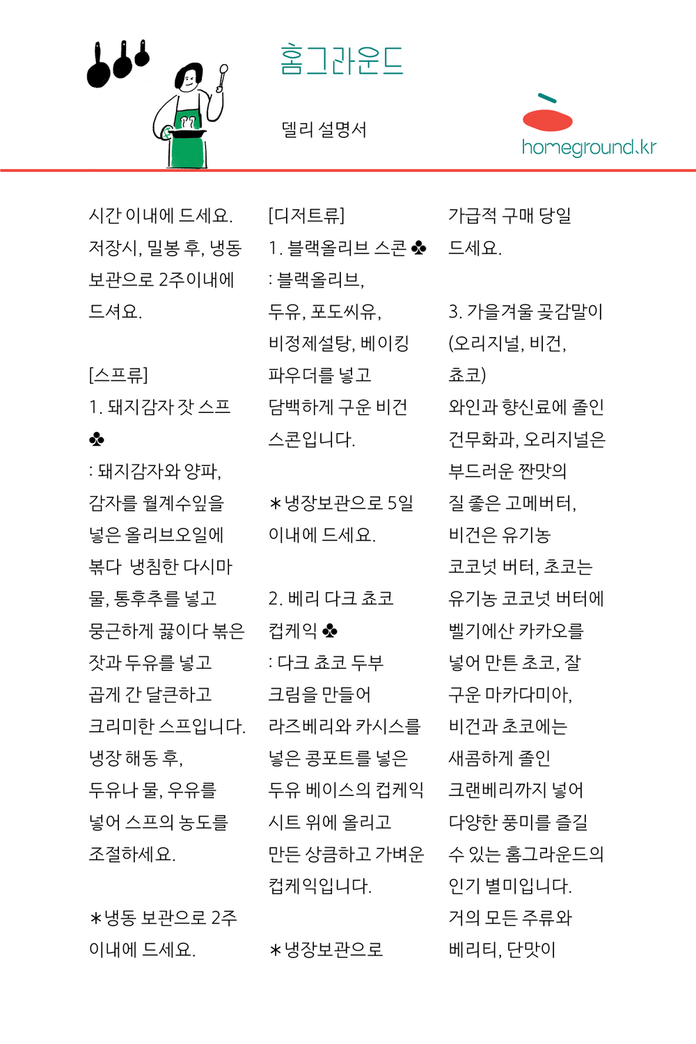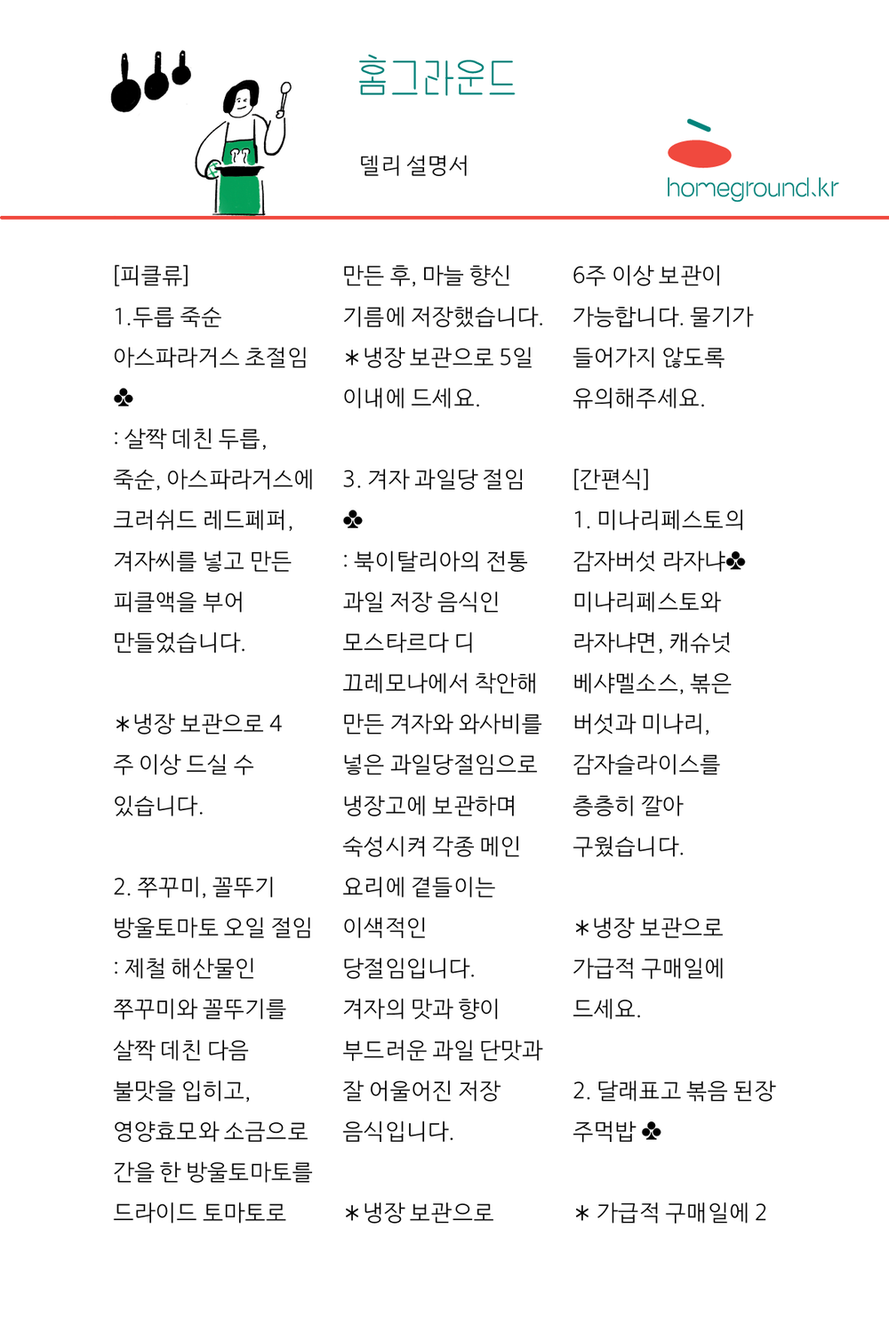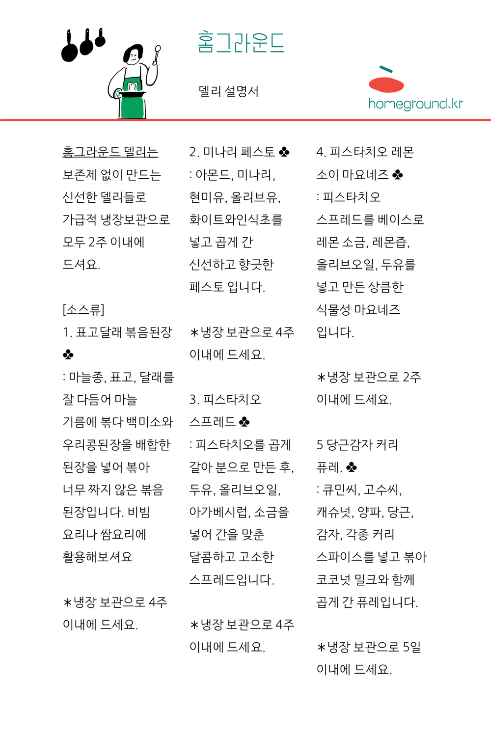 홈그라운드의 델리는 보존제 없이 만드는 신선한 델리들로 냉장, 냉동 보관으로 가급적 모두 2주 이내에 드셔요.